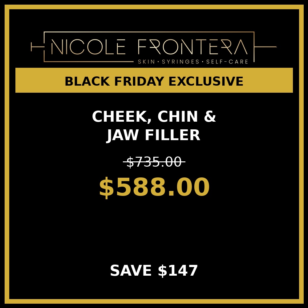 Sculpt and enhance your facial features with strategic filler placement in the cheeks, chin, or jawline. As we age, we naturally lose volume in these areas, leading to a sunken or undefined appearance. Premium dermal fillers restore this lost volume while providing structural support and definition. Cheek filler can lift and volumize the mid-face, reducing the appearance of nasolabial folds and creating a more youthful contour. Chin filler enhances projection and improves profile balance, while jawline filler creates definition and can improve the appearance of jowls. Using advanced injection techniques, our experienced providers create natural, harmonious results that enhance your unique beauty. Treatment takes approximately 45 minutes and includes numbing for comfort. Results are immediate and continue to settle over 2 weeks, lasting 12-18 months. This Black Friday special offers one syringe of premium filler at $147 savings – just $588 (regularly $735). Treatment includes comprehensive consultation, expert injection, and post-treatment care instructions.